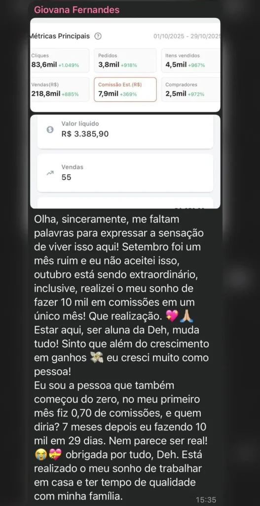 Comparação: Antes e Depois do Curso Fabrica de Comissões Deborah Oliveira